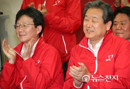 [천지일보=정인선 기자] 4.29 국회의원 재보궐 선거에서 새누리당이 3석을 차지하며 압승을 거뒀다. 29일 서울 여의도 당사 상황실에서 개표방송을 지켜보던 김무성 대표(오른쪽)와 유승민 원내대표가 박수를 치며 환호하고 있다.