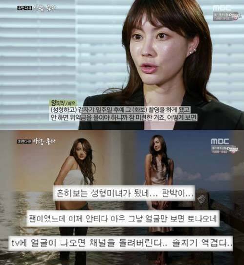 양미라는 “성형수술 후 일주일 만에 모바일 화보를 찍어야 했다. 위약금이 두려워 어쩔 수 없이 촬영장에 갔다”며 “그렇게 거북하게 나올 줄 몰랐다”고 밝혔다.