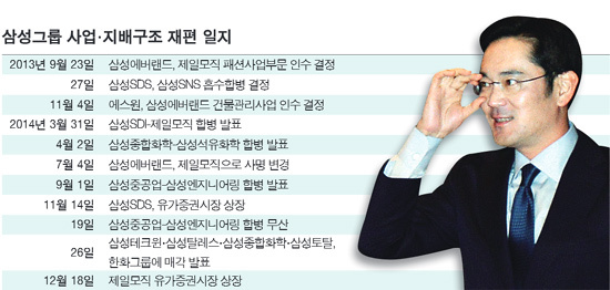 IT서비스 계열사인 삼성SDS와 삼성SNS를 합병해 증시에 상장했다. 또한 삼성그룹은 지난해 11월 말 이재용 부회장 지휘 아래에 삼성종합화학, 삼성토탈, 삼성테크윈, 삼성탈레스 등 4개사를 한화그룹에 매각했다.