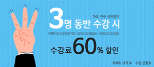 친구 또는 가족 3명 이상 동반 수강 시 한 과목당 60% 할인 혜택 제공