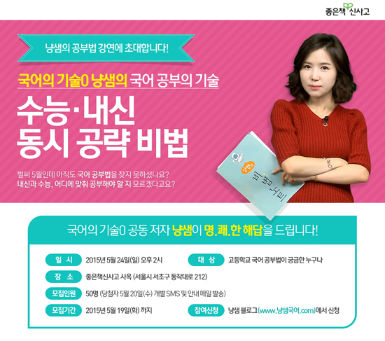 좋은책신사고는 ‘국어의 기술0’의 공동저자 냥샘의 ‘국어 공부법 강연회’를 개최한다. 고등학생 대상으로 하는 이번 강연회는 수능 국어 영역, 내신 동시 공략 비법을 주제로 오는 24일 오후 2시 좋은책신사고 사옥에서 진행된다. 참가를 원하는 사람은 19일까지 냥샘 블로그에서 신청하면 된다. 이번 강연에 참가하는 전원에게는 냥샘의 국어 비법 노트와 신사고 학급 문구 세트를 증정한다.