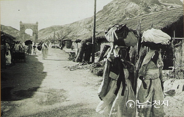 [천지일보=김현진 기자] 독립문을 통과해 아낙네들이 봇짐을 이고 성 안으로 들어오고 있다. 당시 이 거리를 의주통이라 불렀고, 전신 선로가 서울과 신의주간 가설됐다. 뒤편으로 독립문과 무악재가 보인다. (사진제공: 정성길 명예관장)