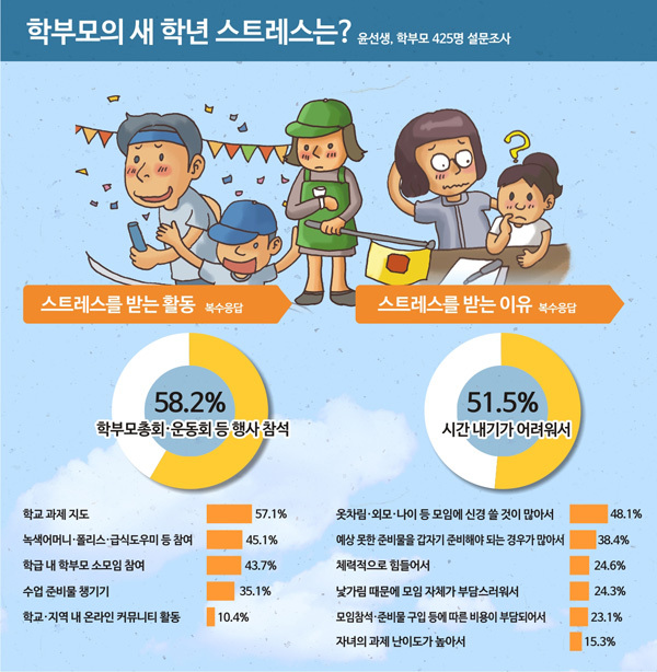 영어교육 전문기업 윤선생 지난 8일부터 13일까지 초등학생 이상 자녀를 둔 학부모 425명을 대상으로 새 학년 활동현황에 대해 설문 조사한 결과, 응답자의 63.1%가 이로 인해 스트레스를 받고 있다고 답했다.
