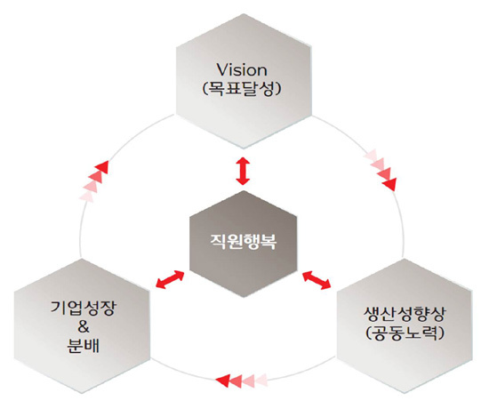 노사 신뢰와 협력으로 기업을 성장시키되, 그 성과로 직원들 분배 몫을 키워 고용조건과 복지 수준을 향상시키고 이를 통해 다시 생산성을 높이자는 취지다. 이 결과물이 일자리 확대 등 사회적 가치 창출에 이어지도록 한다는 것이 핵심이다.