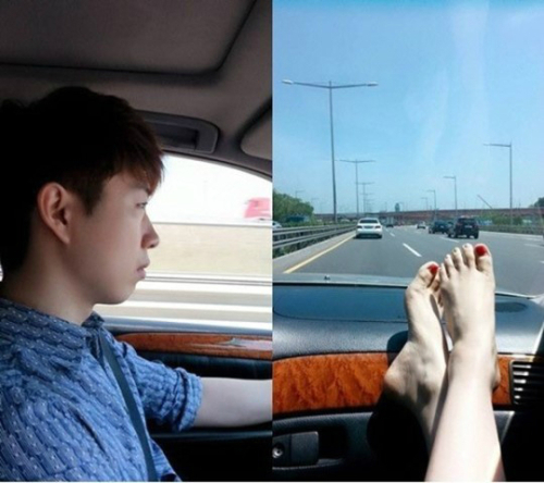 공개된 사진 속 임요환은 운전대를 잡고 있고, 김가연은 자동차 대시보드에 발을 올리고 앉아 있다.