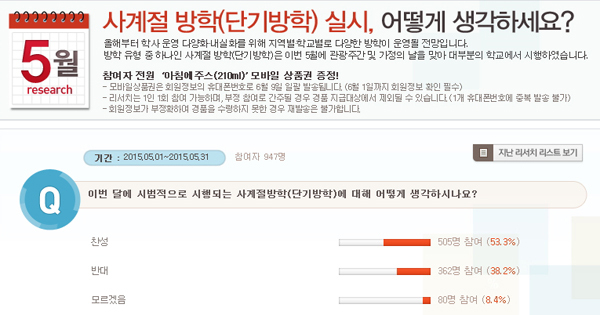 교육전문그룹 비상교육(대표 양태회)의 학부모 교육정보 커뮤니티 맘앤톡이 지난 5월 1일부터 31일까지 한 달간 초등 학부모 회원 947명을 대상으로 ‘단기 방학’에 대한 생각을 묻는 설문을 실시한 결과, 응답자의 53.3%(505명)은 ‘찬성한다’고 답했다. ‘반대한다’는 응답은 38.2%(362명), ‘잘 모르겠다’는 8.4%(80)였다.