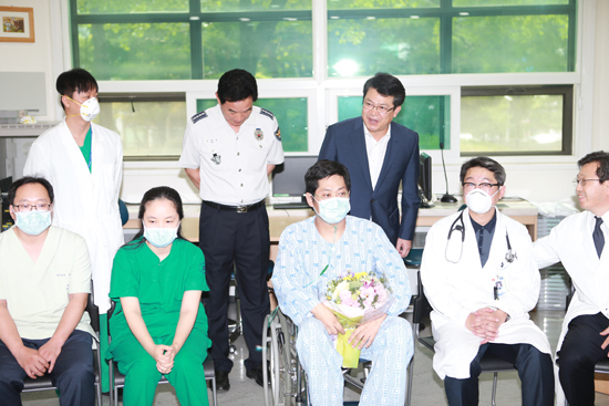이날 복기왕 아산시장은 119번 환자 메르스 완치를 기념해 환자를 격려하고 꽃다발을 전달했다.