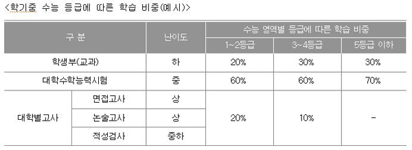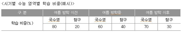 수시모집만으로 대입 합격을 결정지을 수 없기 때문에 수시와 정시 그리고, 전형 자료별로 효율적인 시간 배분과 활용이 중요하다. 수능 영역별 등급 수준에 따른 대학별고사 학습 비중은 수능 1~2등급의 경우, ‘학생부 20%+수능 60%+대학별고사 20%’ 내외, 수능 3~4등급의 경우에는 ‘학생부 30%+수능 60%+대학별고사 10%’ 정도가 일반적이다. 다만 여름방학에는 학생부의 비중을 수능 준비에 포함시키고, 대학별고사는 별도의 학습 계획을 수립하는 것이 필요하다.