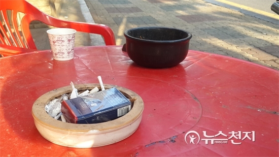 지난 2일 서울시 동대문구 한 음식점 앞에는 음식점을 찾는 흡연자들을 위한 야외용 테이블이 있었다. 실내에선 담배를 피우지 못하는 법 때문에 음식점 앞 길거리에 따로 흡연 테이블을 만든 것이다. 테이블 위에 있는 재떨이에는 담뱃갑과 담배꽁초가 수북하게 쌓여 있다. 음식과 술을 먹다가 담배를 피우고 싶은 손님들은 이 자리에 이 테이블로 나와서 피우고 들어간다. 테이블이 보도 중간에 있어 행인들은 담배 연기를 그대로 마신다.