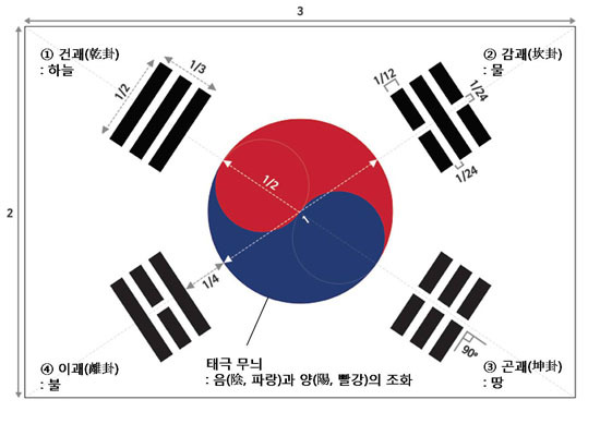 괘의 가로 길이는 가운데 태극 무늬 지름의 1/2이며, 세로 길이는 1/3이다. 또한 괘를 구성하는 각각의 효 두께는 태극 지름의 1/12, 괘 사이의 간격은 태극 지름의 1/24이다.