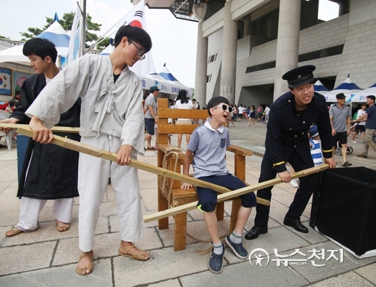 [천지일보 아산=박주환 기자] 15일 충남 천안 독립기념관에서 광복 70주년을 맞아 태극기 바로알기, 무궁화 꽃 만들기, 독립투사 고문체험 등 다채로운 체험행사가 열렸다. 광복70주년 행사에서 한 어린이가 독립투사 고문체험을 하고 있다.