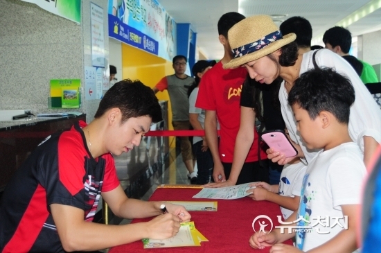 [천지일보 화순=이진욱 기자] 지난 13일부터 전남 화순군 하니움문화스포츠센터 일원에서 열린 이용대 올림픽제패기념 ‘2015 전국 학교 대항배드민턴 대회’가 막바지에 접어든 가운데 18일 이용대 선수가 고향을 방문, 팬 사인회가 열렸다.