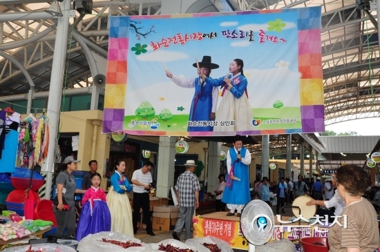 [천지일보 화순=이진욱 기자] 18일 오전 전남 화순군(군수 구충곤) 화순전통시장 장날을 맞아 장옥 공연장에서 노수영(화순군, 제일초교 5)군이 '심청가 중 심봉사가 황성으로 가는 대목'을 열창했다.