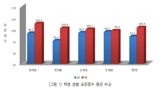 성별로 살펴보면 여학생의 우위가 두드러졌다. 여학생의 과목별 표준점수 평균은 ▲국어A 102.6 ▲국어B 100.6 ▲수학A 100.2 ▲수학B 99.5 ▲영어 100.9로 남학생의 과목별 표준점수 평균 ▲국어A 98.5 ▲국어B 95.2 ▲수학A 98.7 ▲수학B 99.1 ▲영어 97.1보다 각각 ▲국어A 4.1점 ▲국어B 5.4점 ▲수학A 1.5점 ▲수학B 0.4점 ▲영어 3.8점이 높았다.