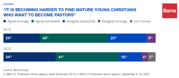 보고서에 따르면 미 목회자의 평균 연령은 52세로, 40세 이하의 목회자는 16%에 불과했다. 미 담임목사 10명 중 7명(70%)은 ‘미래 목회자들의 자질이 걱정된다’는 문항에 ‘그렇다’고 답했다. 또 응답자 4명 중 3명(75%)이 ‘목회자를 목표로 하는 성숙한 신앙인을 찾기 어려워졌다’는 말에 동의했다. 이는 2015년 미 개신교 담임목사 901명을 조사한 설문 결과(69%)와 비교하면 6%p 상승한 수치다.
