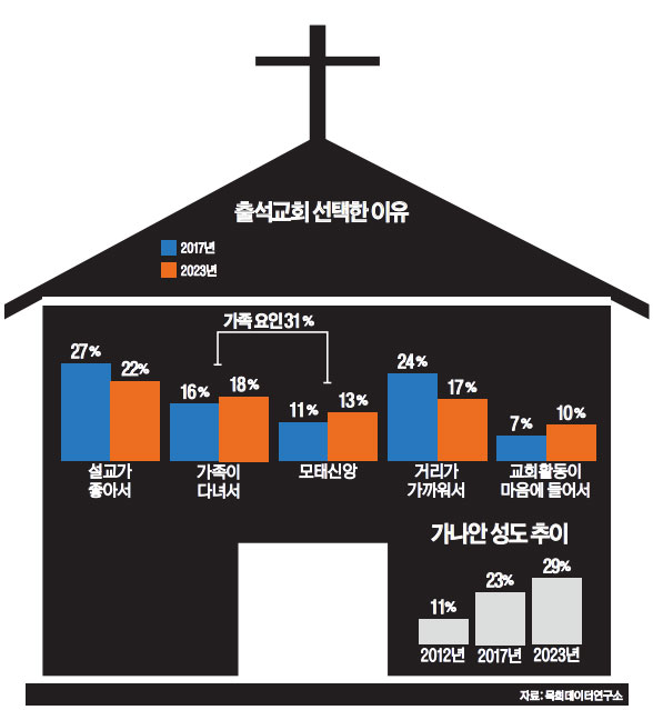 개신교인에게 현재 출석하는 교회를 선택한 이유를 물은 결과, ‘목회자·설교 내용이 좋아서’가 22%로 가장 높았고, 그다음으로 ‘가족이 다녀서’, ‘거리가 가까워서’ 순으로 나타났다.