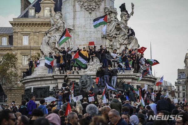 [파리=AP/뉴시스] 22일(현지시각) 프랑스 파리에서 팔레스타인-이스라엘의 지속적 평화를 위한 집회가 열려 참석자들이 팔레스타인 깃발을 흔들고 있다. 2023.10.23.