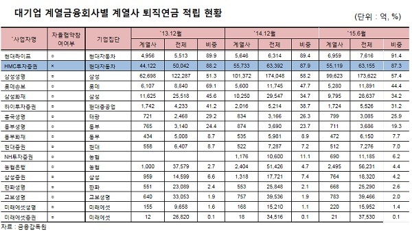 오 의원이 금융감독원으로부터 제출받은 ‘최근 3년간 대기업의 계열금융회사 퇴직연금 적립 현황’을 보면 자율협약이 시행된 2013년 말에는 계열금융회사에 적립된 대기업 퇴직연금액은 13조 7000억원에서 2015년 6월 기준, 18조 6000억원으로 4조 9000억원(36.1%) 증가했다.