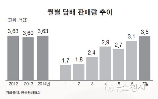 실제로 국회 기획재정위원회 소속인 새정치민주연합 윤호중 의원이 한국담배협회로부터 제출받아 공개한 자료에 따르면 지난 7월 담배판매량은 3억 5000만 갑으로 나타났다. 이는 지난 2012년부터 최근 3년간 월평균 판매량 3억 6200만 갑과 거의 비슷한 수준이다.