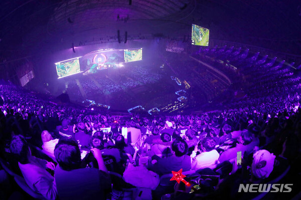 [서울=뉴시스] 2023 리그오브레전드(LoL·롤) 월드 챔피언십 결승전이 열린 19일 서울 구로구 고척스카이돔에서 한국선수단 T1 과 중국선수단 웨이보 게이밍 선수들이 경기를 펼치고 있다. 2023.11.19.