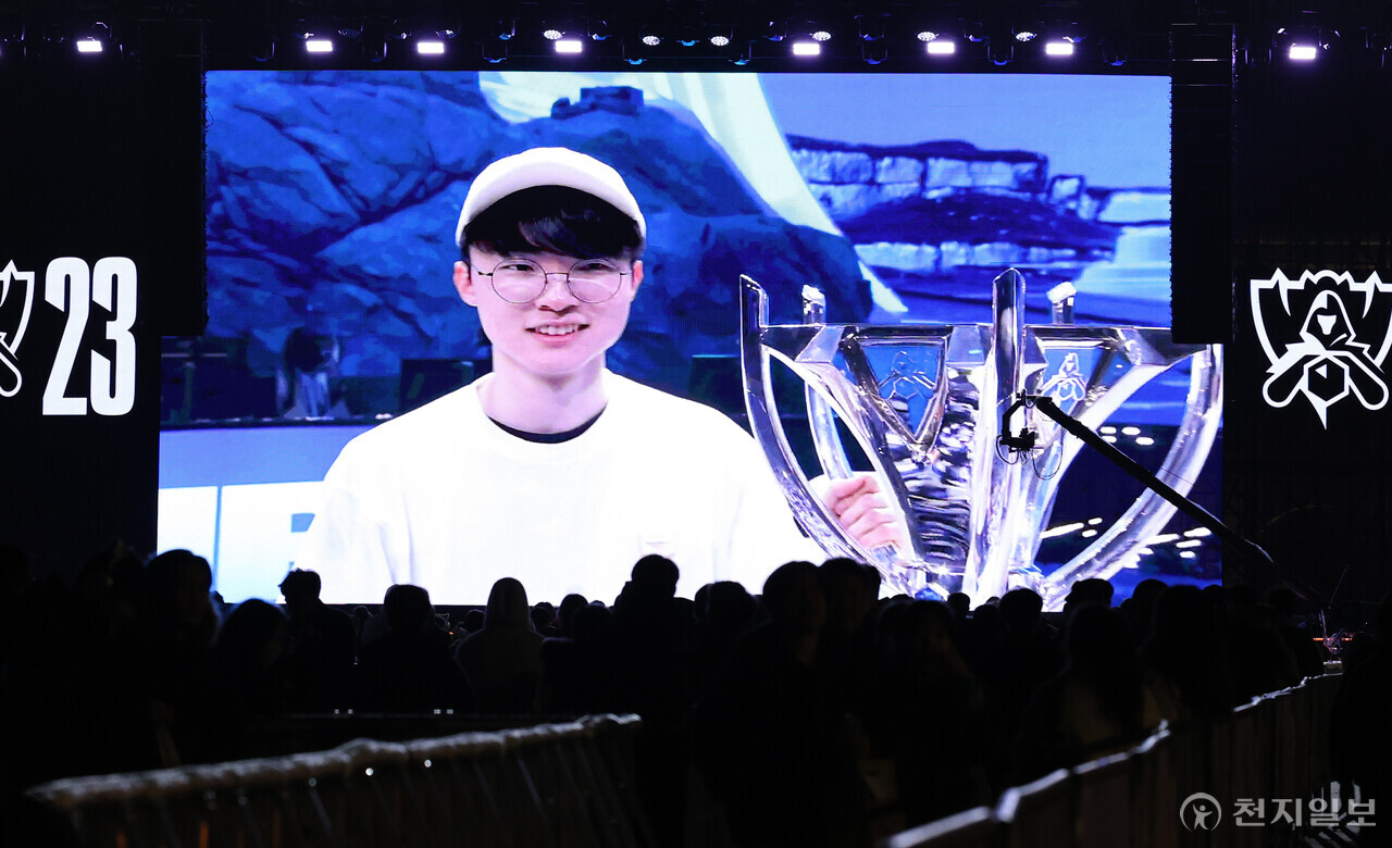 [천지일보=박준성 기자] 19일 오후 서울 종로구 광화문광장에서 ‘2023 리그오브레전드(LoL, 롤) 월드 챔피언십 결승전’ 거리응원에 나온 e스포츠 팬들이 대한민국 T1과 중국 웨이보 게이밍의 경기에서 우승한 T1의 페이커(이상혁)가 우승 트로피 곁에 서니 환호하고 있다. T1은 2013년, 2015년, 2016년에 이어 통산 네 번째 우승을 거뒀다.