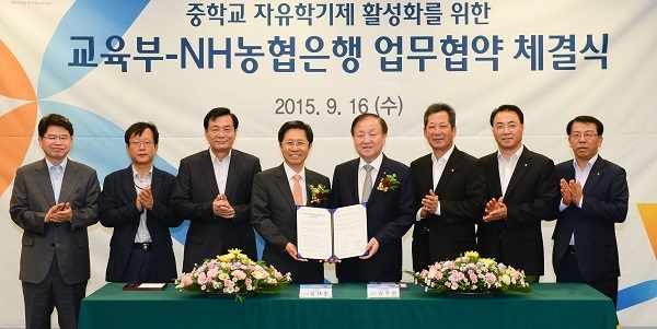 이번 협약으로 농협은행은 2015년 2학기부터 본격적으로 운영되는 자유학기제 운영중학교 학생 10만여명에게 은행직업체험, 경제·금융교육, 진로멘토링, 창의·문화예술융합교육 등 행복채움금융교실을 지원한다.