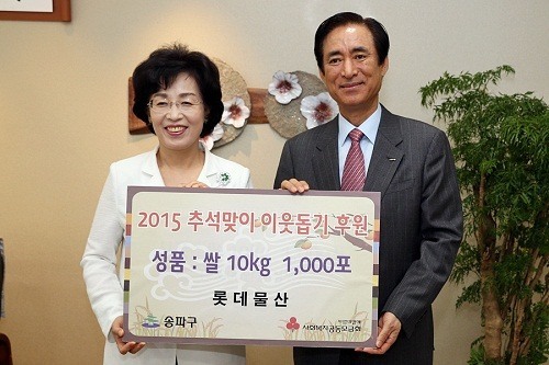 롯데물산은 노병용 대표이사가 최근 추석을 앞두고 외로이 명절을 보내는 송파구 지역 저소득층 주민들을 돕기 위해 송파구청을 방문해 쌀 1000포를 전달했다고 18일 밝혔다.