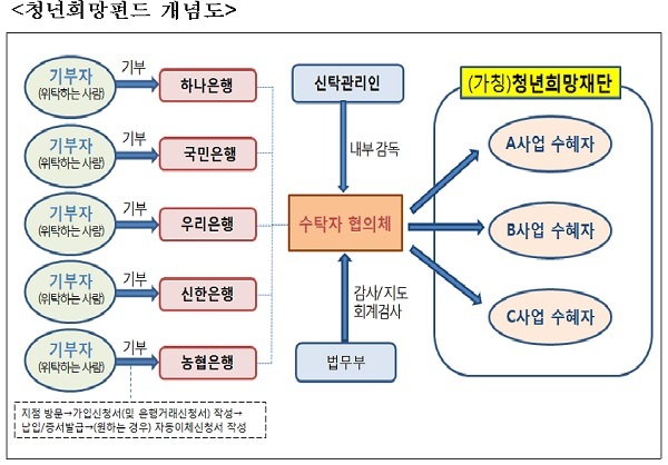 한편 KEB하나은행과 KB국민·우리·신한·농협은행은 이날 ‘청년희망펀드 공익신탁’ 상품을 공동으로 출시했다. 창구가입은 KEB하나은행은 21일부터 시작하고 나머지 4개 은행은 22일부터 시작한다. 인터넷 뱅킹 가입은 KEB하나은행은 22일부터, 나머지는 오는 30일부터 가능하다.