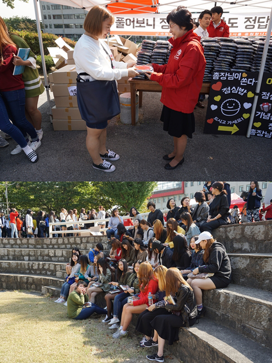 지난 6일에는 인제캠퍼스에서, 7일에는 해란캠퍼스에서 오후 12시부터 1시간 동안 진행된 이번 간식행사는 엄태식 총장이 참여해 중간고사를 준비하는 수원여대 재학생들에게 직접 도시락을 나눠줬다. 엄태식 총장은 재학생 홍보대사 ‘신디’와 함께 단체복을 맞춰 입고 밝은 미소로 학생들을 격려했다.