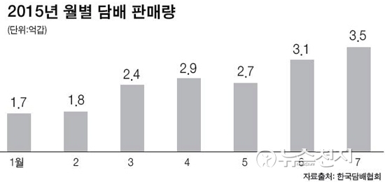 지난 9월 국회 기획재정위원회 소속인 새정치민주연합 윤호중 의원이 한국담배협회로부터 제출받아 공개 한 자료에 따르면 지난 7월 담배판매량은 3억 5000만 갑으로 나타났다.