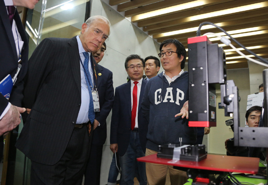 한 시간가량 현장을 둘러본 앙헬 구리아 사무총장은 “하이테크에 기반한 벤처기업을 성장시킬 수 있는 좋은 모델”이라며 “일자리는 대기업이 아닌 새로 시작하는 회사가 창출하는데 이런 기관을 통해 일자리를 만들어 내는 회사들이 많아지면 좋겠다”고 말했다.