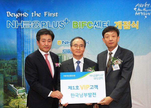 ▲ NH농협금융이 지방 최초로 ‘은행+보험+증권’이 결합한 신복합점포 ‘NH농협금융PLUS+ BIFC센터+’를 부산국제금융센터에 개설하고 1호 고객과 기념촬영을 하고 있다. 왼쪽부터 NH투자증권 동부지역본부 김대영 본부장, 한국남부발전 신성현 경영전략처장, NH농협은행 부산영업본부 하상경 부행장보. (사진제공: NH농협금융지주)