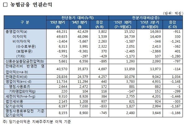 NH투자증권의 2015년 3분기 누적 당기순이익은 2261억원(명칭사용료 부담전 기준 2346억원)을 시현했다. NH-CA자산운용은 당기순이익 81억원, NH농협캐피탈과 NH저축은행은 각각 180억원, 70억원의 3분기 누적 당기순이익을 각각 시현하여 손익 기여도를 높이고 있다.