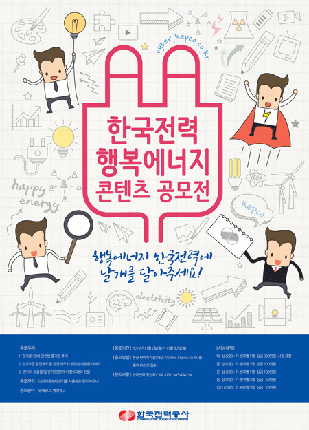 [천지일보=이태교 기자] 한국전력공사(사장 조환익)가 ‘2015년 한국전력 행복에너지 콘텐츠 공모전’을 개최한다. 한전은 오는 11월 2일부터 30일까지 접수를 받는다.
