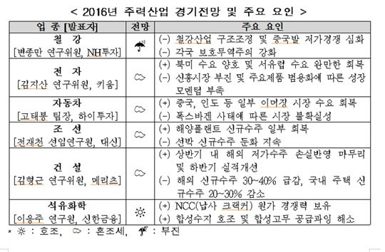 건설 산업은 상반기 내 중동지역의 저가수주 손실반영이 마무리됨에 따라 하반기부터 실적이 개선될 것으로 내다봤다. 반면 2015년 대비 국내 주택 신규수주 20~30% 감소 및 유가하락에 따른 2015년 대비 중동지역의 신규수주 급감이 위기 요인으로 꼽혔다.