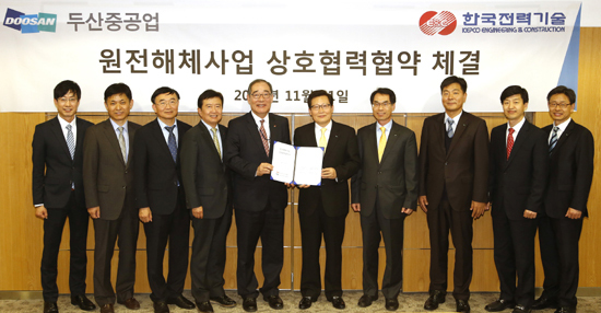 두산중공업 관계자는 “원전기술의 축인 ‘설계’와 ‘주기기 제조’ 부문을 대표하는 전문기업 간 협력이라는 데 큰 의미가 있다”며 “양사의 협력과 시너지로 향후 고리 원전 1호기를 비롯한 국내 원전해체 사업은 물론, 해외시장 진출에도 적극 나서겠다”고 말했다.
