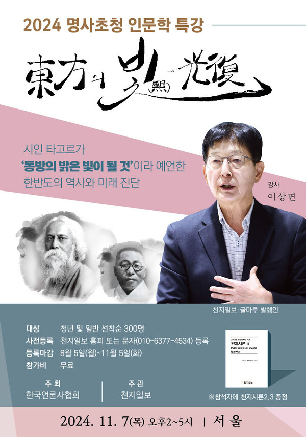 ㈔한국언론사협회(협회, 회장 주동담)가 ‘2024 명사초청 인문학 특강’을 진행하는 가운데 사전등록 마감이 임박했다. 특강은 협회가 주최하고 천지일보가 주관하며 오는 11월 7일(목) 오후 2~5시 서울에서 진행한다.