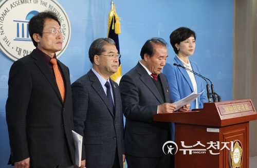 [천지일보=김민아 기자] 전국시도교육감협의회를 대표해 장휘국 광주시교육감이 30일 국회 정론관에서 누리과정 예산 문제 해결을 촉구하는 기자회견을 열고 중앙정부의 의무지출경비 편성, 사회적 논의기구 구성 등을 제안하고 있다. 사진은 (왼쪽부터) 조희연 서울시교육감, 이재정 경기도교육감, 장휘국 광주시교육감, 새정치민주연합 유은혜 대변인.