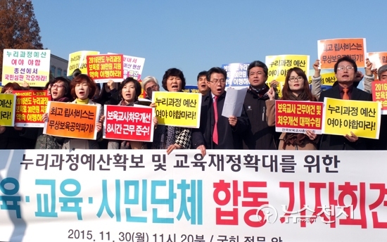 이들은 30일 서울 영등포구 국회 정문 앞에서 기자회견을 열고 “지난 18대 대선 당시 박근혜 대통령과 정부 여당은 0~5세 무상 보육과 교육에 대한 국가완전책임제를 약속했다. 그러나 정부는 시도교육청을 압박해 예산 편성을 강제하고 있다”고 비판했다.