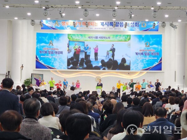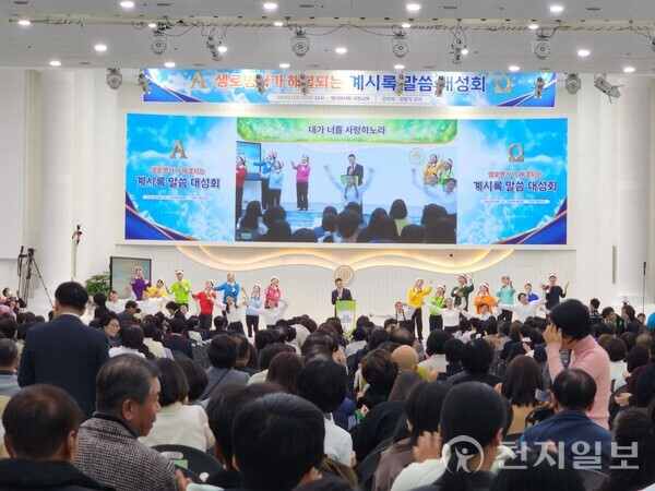 [천지일보 대전=김지현 기자] 신천지예수교 증거장막성전(신천지예수교회, 총회장 이만희) 맛디아 지파(지파장 장방식) 대전교회 대성전에서 1일 ‘생로병사가 해결되는 계시록 말씀대성회’가 개최되고 있다. 산타클로스 복장 등으로 연말 분위기를 연출한 찬양단이 힘차고 신나게 찬양을 인도하고 있다.