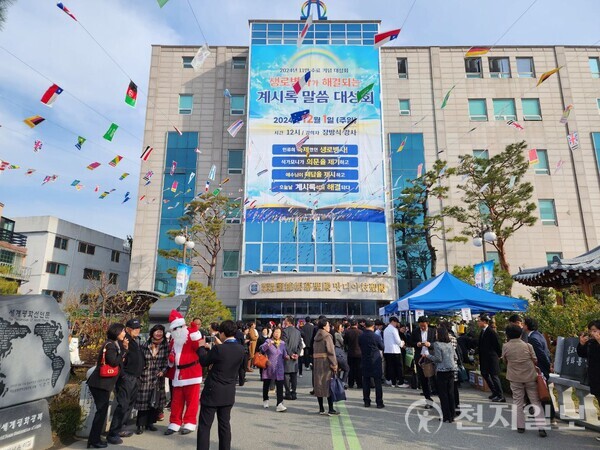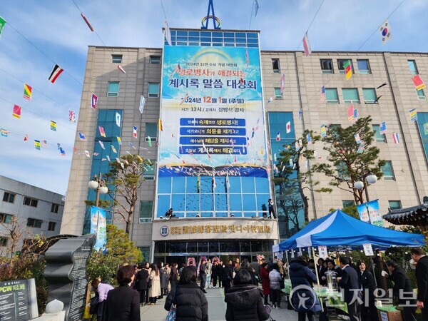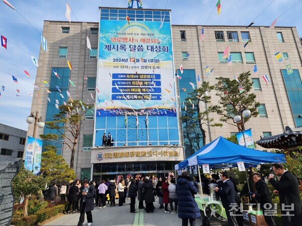[천지일보 대전=김지현 기자] 신천지예수교 증거장막성전(신천지예수교회, 총회장 이만희) 맛디아 지파(지파장 장방식) 대전교회 대성전에서 1일 ‘생로병사가 해결되는 계시록 말씀대성회’가 시작되기 전, 참석자들이 입장하고 있다. 대전교회 마당에서는 따뜻한 간식을 준비해 함께 나누고 산타클로스 할아버지가 작은 선물을 나눠주며 참석자들을 반겨주고 있다.