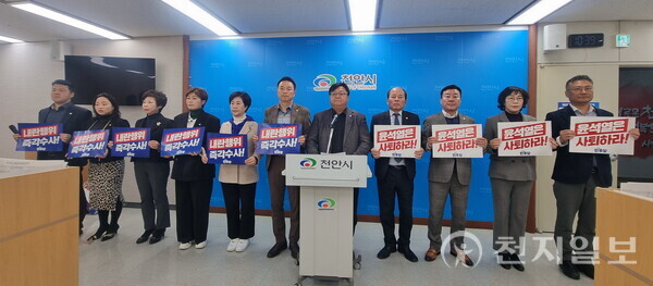 [천지일보 천안=박주환 기자] 충남 천안시의회 더불어민주당 소속 의원들이 5일 천안시청 브리핑실을 찾아 지난 3일 윤석열 대통령의 비상계엄 선포·해제와 관련해 “윤석열은 사퇴하라”고 촉구하는 기자회견을 하고 있다.