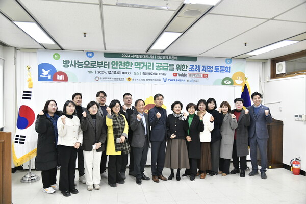 [천지일보 청주=김흥순 기자] 이상식(더불어민주당, 청주9) 충북도의회 정책복지위원장(정 가운데)이 13일 의회 대회의실에서 토론 참석자들과 화이팅 포즈로 기념 사진을 찍고 있다.