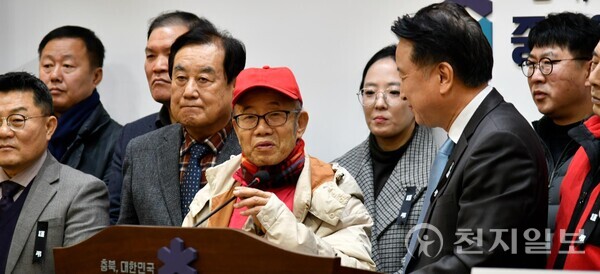 [천지일보 충북=김흥순 기자] 청주시 성안동에 거주하는 한 어르신(왼쪽에서 다섯 번째)이 29일 오전 충북도청 브리핑룸에서 ‘일하는 밥퍼’ 사업을 체험한 소감을 밝혔다.