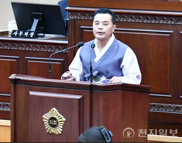 [천지일보 충북=김흥순 기자] 박지헌(국민의힘, 청주4) 충북도의원이 20일 오후 의회 본회의장에 마련된 의사발언대에서 한복을 입고 5분 자유발언을 하고 있다.