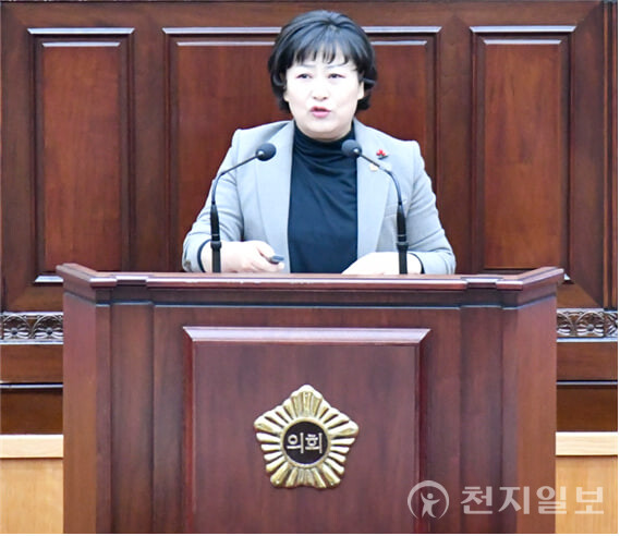 [천지일보 충북=김흥순 기자] 김꽃임(국민의힘, 제천1) 충북도의원이 24일 오전 의회 본회의장에서 5분 자유발언을 하고 있다.