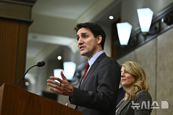 [오타와(캐나다)=AP/뉴시스]쥐스탱 트뤼도 캐나다 총리가 1일(현지시각) 캐나다 오타와에서 도널드 트럼프 미 대통령이 캐나다, 멕시코, 중국을 상대로 높은 관세를 부과한 것과 관련, 연설하고 있다. 그는 미국으로부터의 수입품 1550억 달러(226조365억원) 상당에 25%의 보복관셰를 부과할 것이라고 밝혔다.