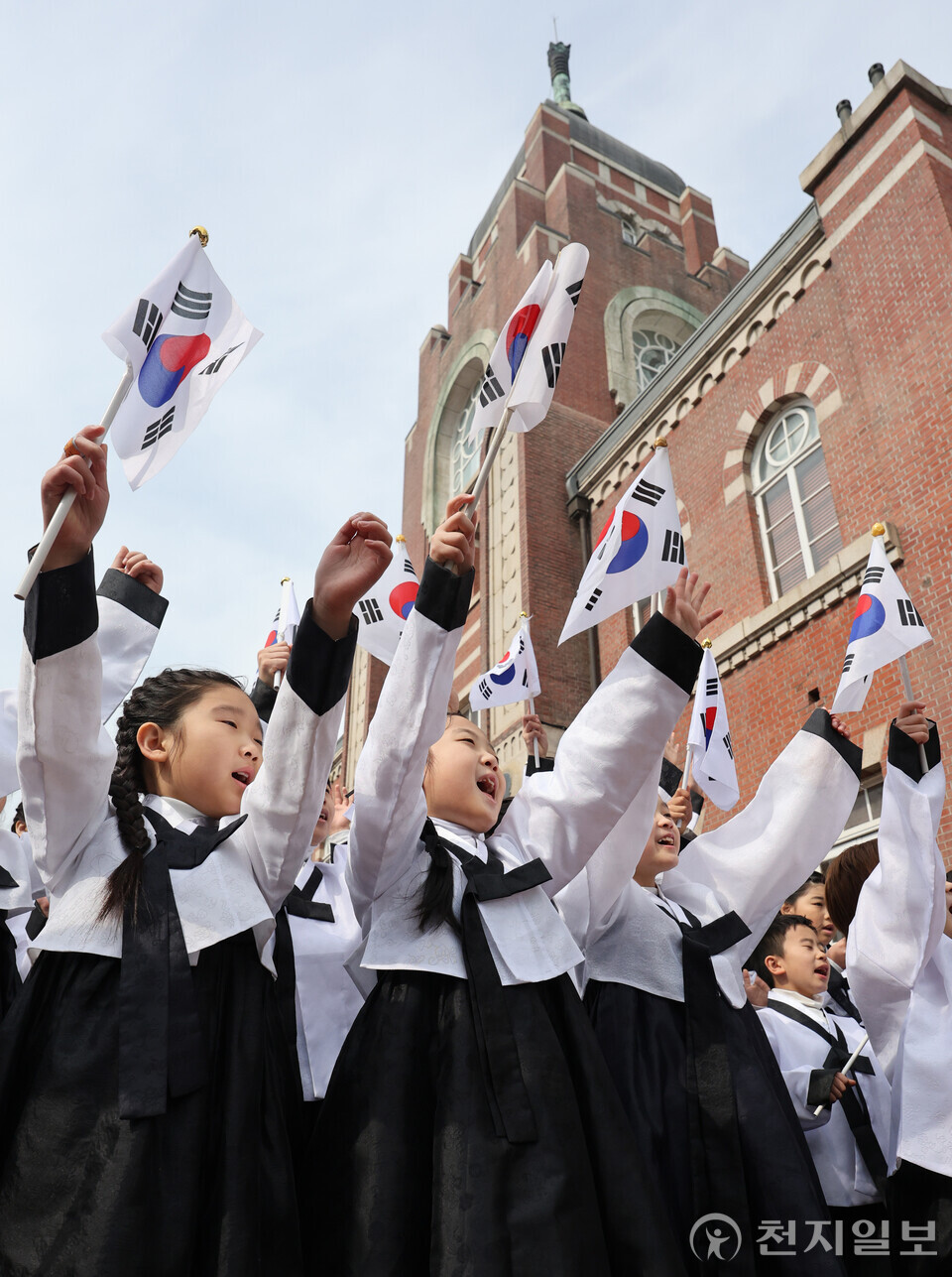 [천지일보=남승우 기자] 1일 서울 종로구 천도교중앙대교당에서 열린 제106주년 3.1절 기념식에서 시민들이 만세삼창을 하고 있다.