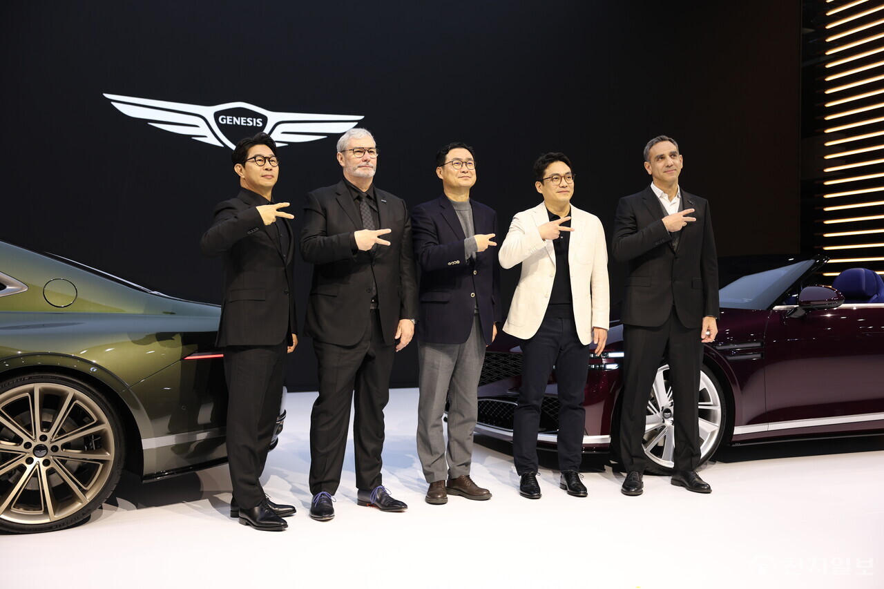 [천지일보=이재빈 기자] 제네시스가 3일 경기도 고양시 킨텍스에서 열린 ‘2025 서울모빌리티쇼’에서 브랜드 출범 10주년을 맞아 두 종의 플래그십 콘셉트카와 고성능 하이퍼카를 공개하며 새로운 럭셔리 모빌리티 비전을 제시했다. 사진은 정유석 현대자동차 부사장(가운데)과 임원들이 이날 세계 최초로 공개된 ‘엑스 그란 쿠페·컨버터블(X Gran Coupe·Convertible)’을 배경으로 기념사진을 촬영하고 있는 모습.