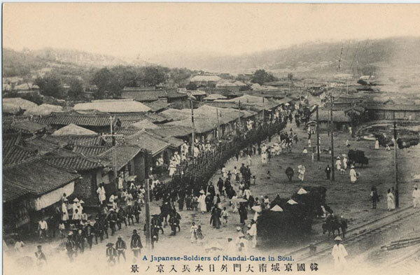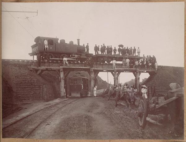 ▲ 용산행 전차선로와 경의철도가 교행하는 지점으로 다수의 일본군인들이 증기기관차 위에서 자세를 취하고 있고, 그 아래로 전차와 소달구지가 지나가고 있다. (사진제공: 서울역사박물관)